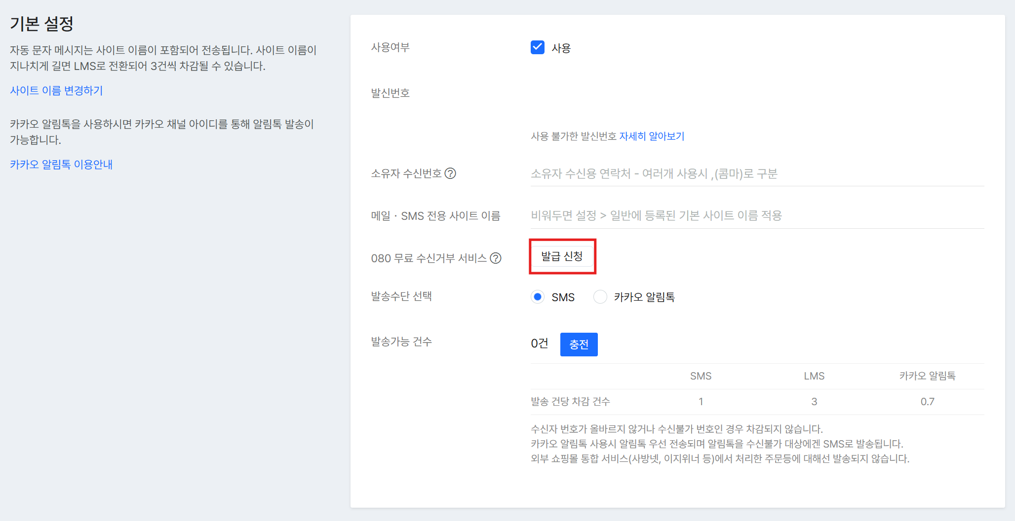 신청 경로: 문자·알림톡 설정 페이지 사이트주소/admin/member/sms에서 [080 무료 수신거부 서비스]를 눌러 발급신청