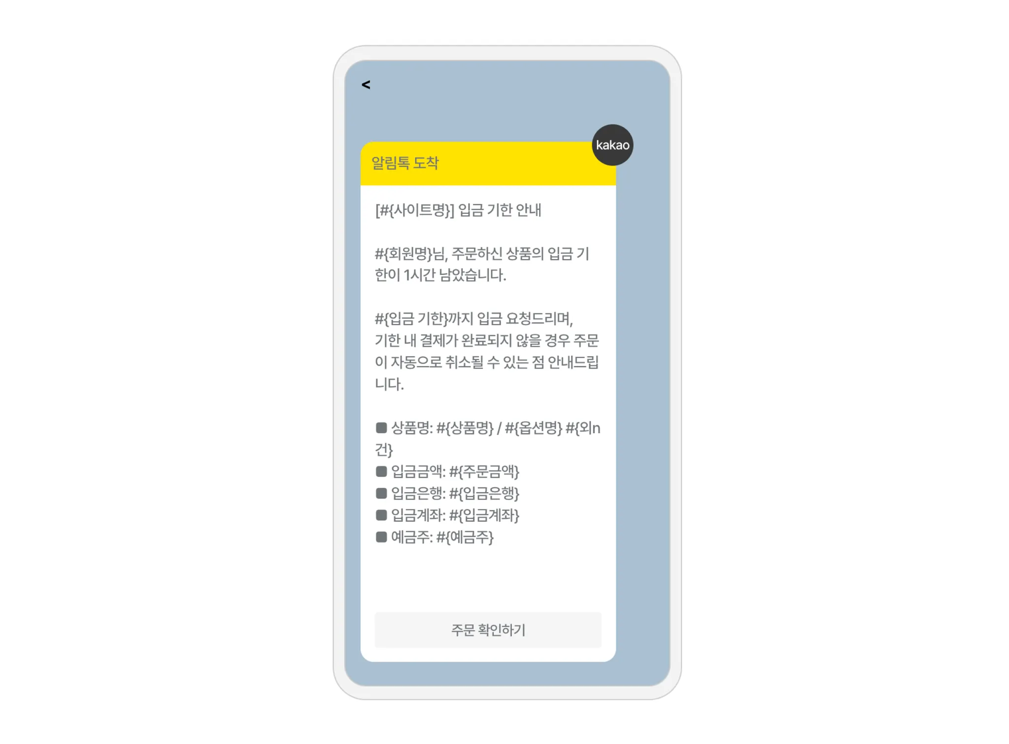 가상계좌·무통장입금 주문의 경우, 구매 의사가 있었음에도 입금 기한을 인지하지 못해 자동 취소되는 경우가 많아 알림톡/문자를 활용한 알림을 통해 주문건이 결제 완료가 되도록 도울 수 있습니다.